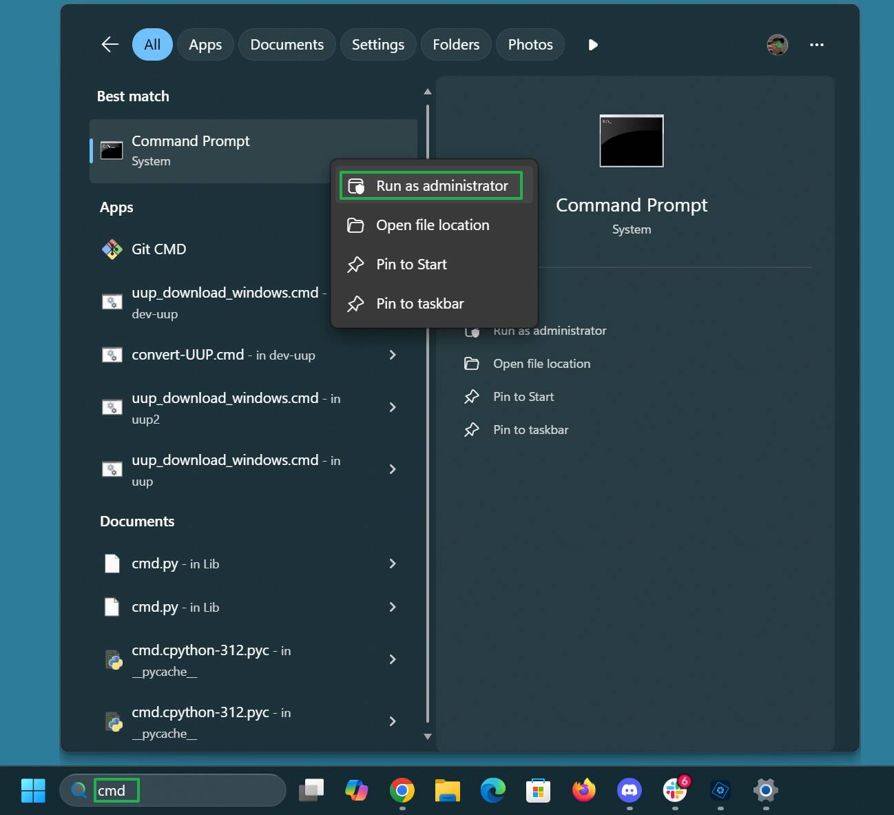 Then open an elevated command prompt by searching for cmd, right clicking the top result, and selecting Run as administrator.