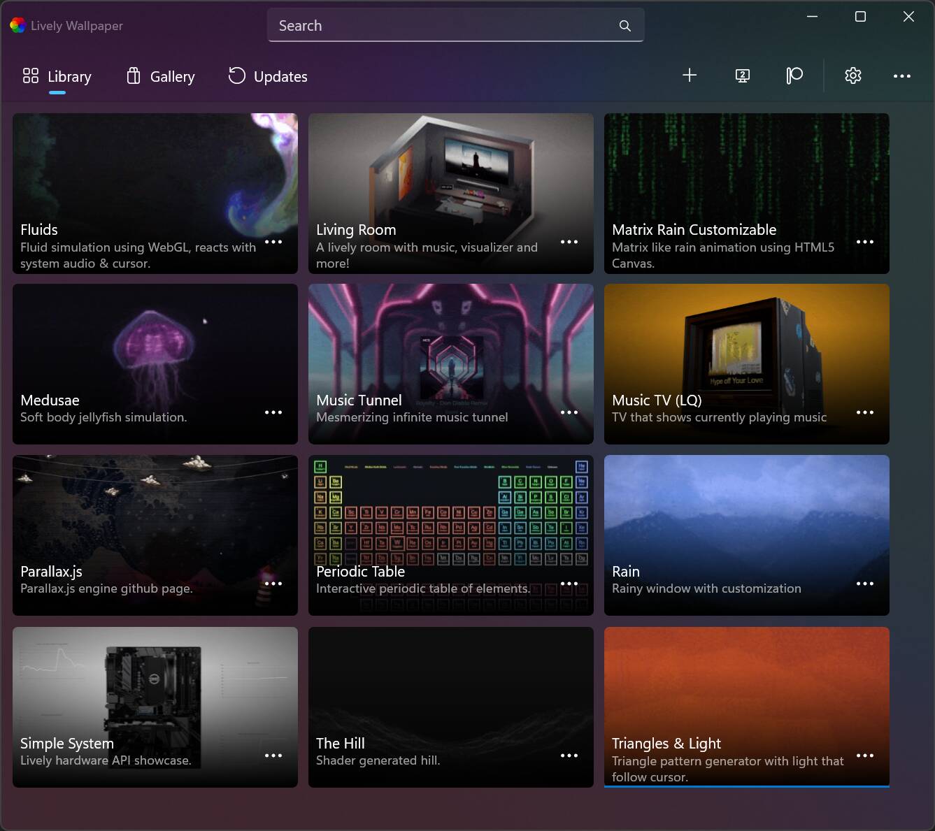 After you've installed and opened Lively Wallpaper, you're shown a list of 12 desktop wallpapers that are preloaded. These are actually more advanced than a standard animated wallpaper because they change and show colors based on where you move your cursor.