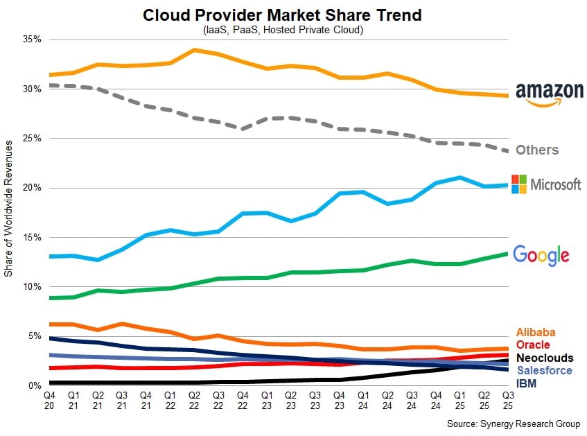 According to its figures, the big three operators – Amazon (AWS), Microsoft (Azure) and Google Cloud – accounted for a collective 63 percent of enterprise cloud infra spending during Q3 of 2025. In the same quarter a year ago, it was 62 percent, and a year before that, it was 61 percent, showing that the cloud triumvirate continues to gradually take market share from the other players.