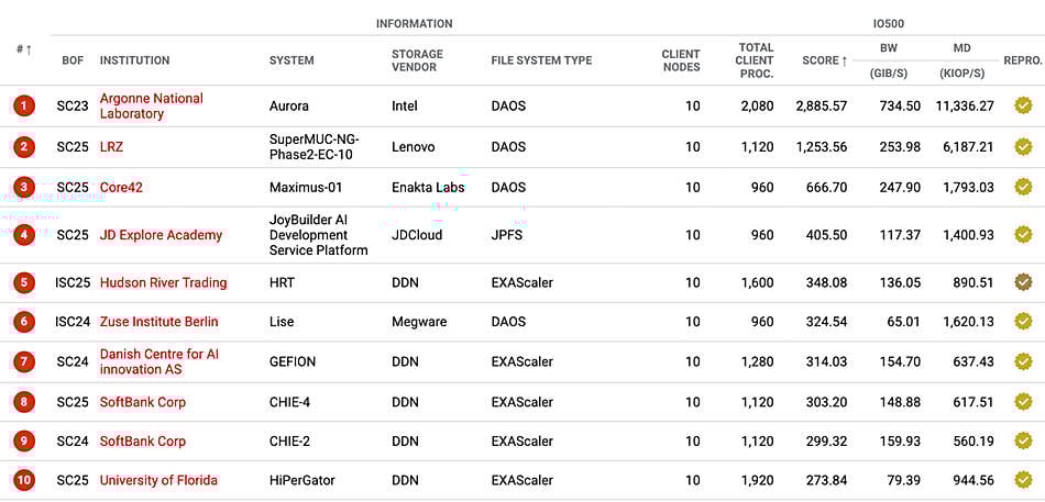 The DAOS parallel filesystem has a strong IO500 presence, holding positions 1 (Argonne) and 2 (LRZ) in the current Production SC25 list. The two, according to HPE, combined have four times the storage benchmark score of the next 30 storage systems. DAOS also appears at number 13 (Zuse Institute, Berlin), and 17 (China Telecom Research Institute). The software appears more often in the full IO500 list, with 16 of the top 30 submissions using DAOS, and 26 of the top 45 being DAOS devotees.