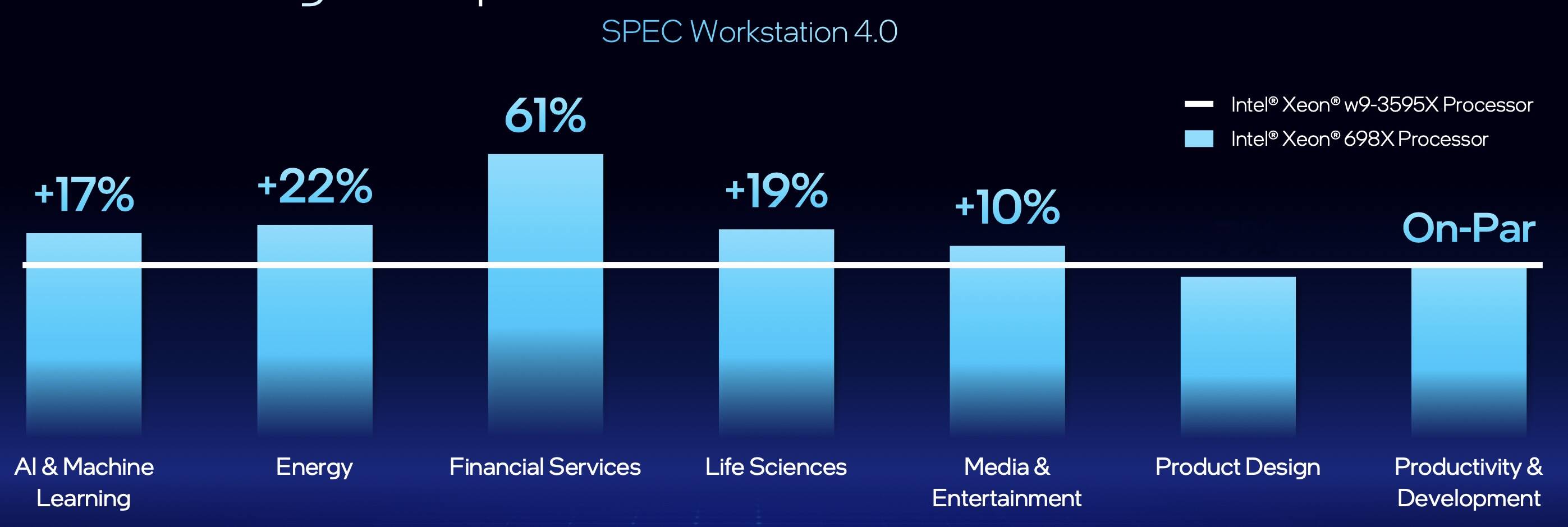 However, by Intel's own admission, performance varies wildly depending on the workload. Intel's SPEC Workstation 4.0 benchmarks show that 61 percent performance uplift was specific to financial services workloads. In some cases like product design, Intel's 86 core Xeon 698X actually underperformed its predecessor.